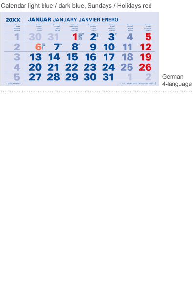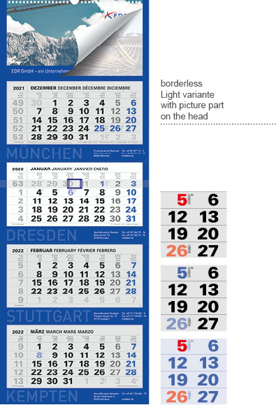 The Varius image also offers you the possibility of a 12-sided image part on the head. Tied with a wire-o binding, it's the highlight in the office. The calendars are available in various languages and colours, with an option of beginning in October.