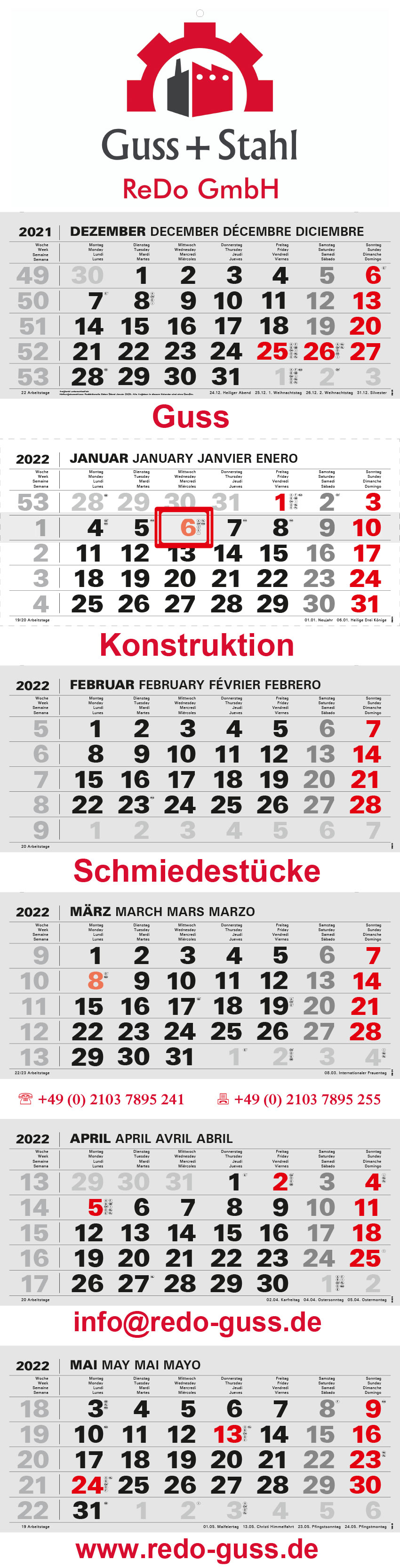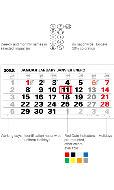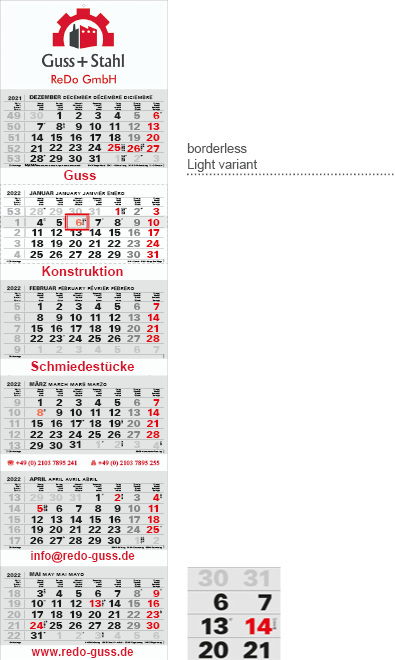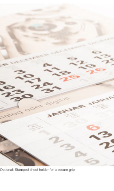 The Varius with 6 calendar blocks and a continuous rear panel - inarrow version here with elegant, compact look. The rear wall is divided into two parts. Between the blocks, there is also space for advertising or an extended image motif. The calendar has various language versions and can be custom-adapted.