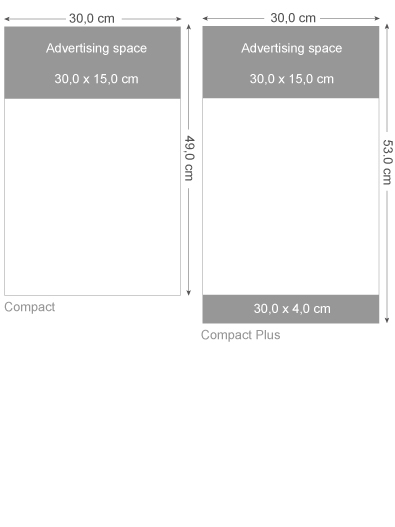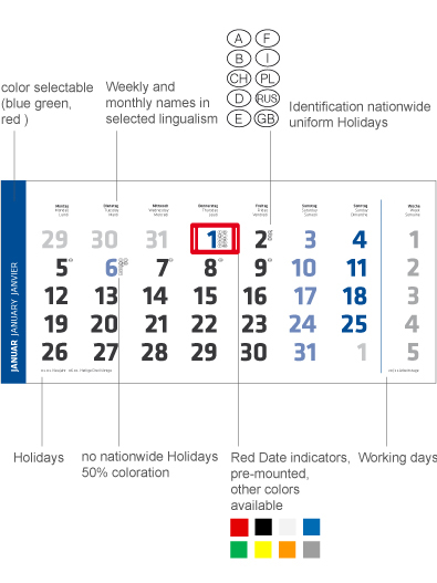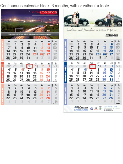 On-trend and fresh, this compact calendar is available in 3 colours. The block is continuous and can be torn off. Advertising is at the top; the Plus version can also include advertising in the footer as an option. Custom calendar adaptations can be made on request.