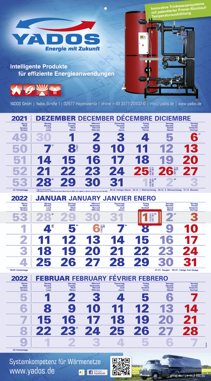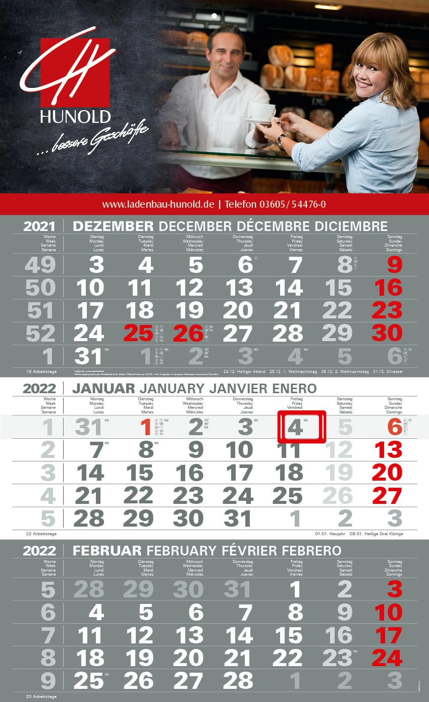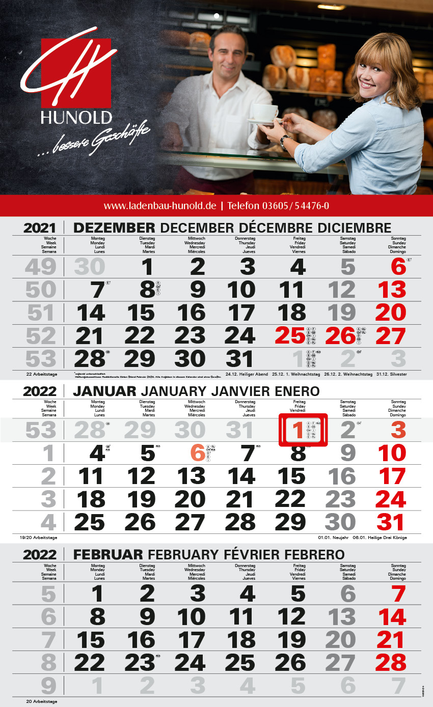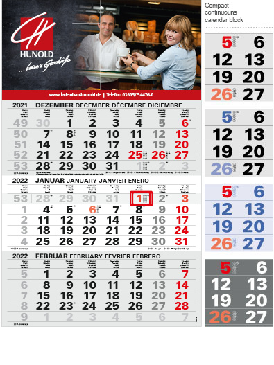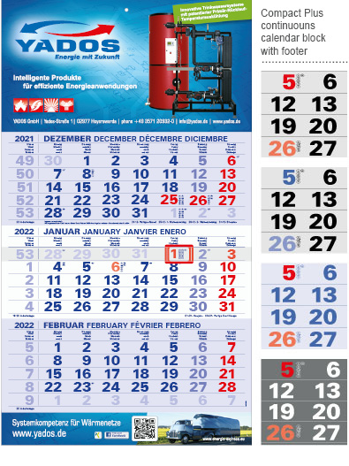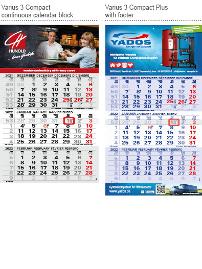Our compact calendars have a continuous calendar block to tear off. The advertising space is at the top; in the plus version it is also at the bottom. The compact calendar is available either folded or flat. We recommend digital printing for volumes below 200.