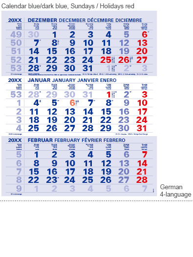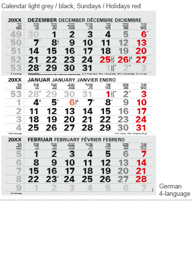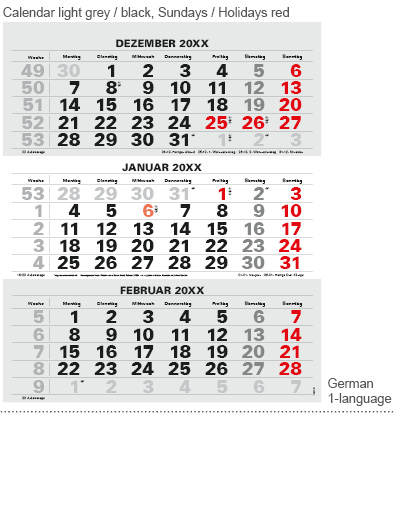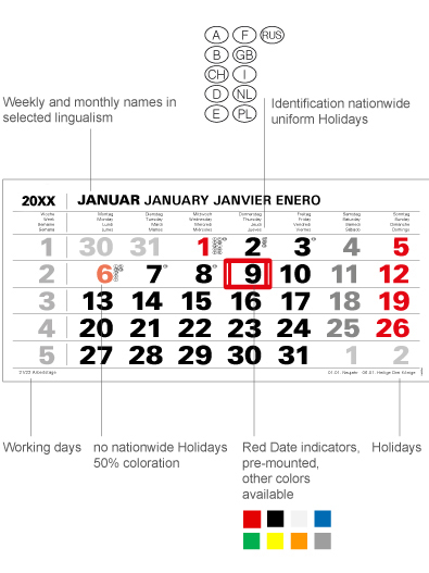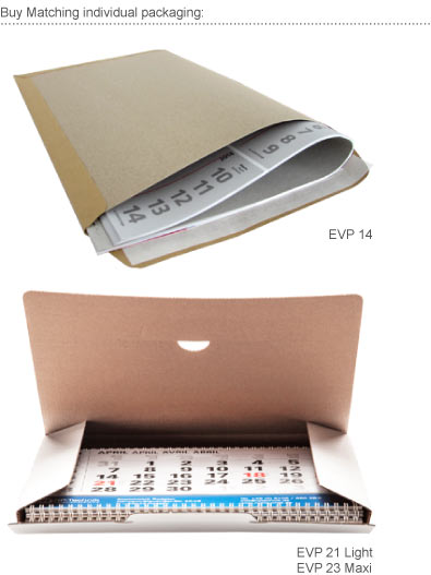 Offset printing: Calendar block 80 g/m² Offset printing paper Top flap/footer coated FBB board (GC) Block back 300 g/m² grey cardboard Digital printing: Calendar block 80 g/m² Offset printing paper Top flap/footer 300 g/m² coated SBS board (GZ) Block back 300 g/m² grey cardboard |