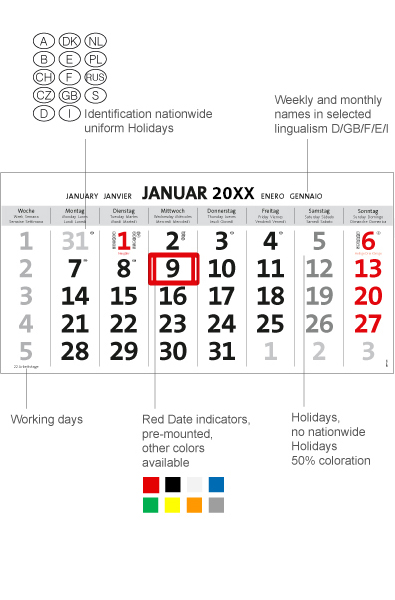 • Identification of standard national public holidays for A/B/CH/CZ/D/DK/E/F/GB/I/NL/P/PL/S