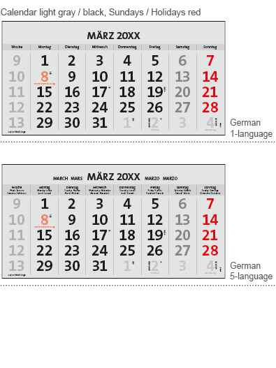 • light grey/black, Sunday and public holiday red (HKS 14)