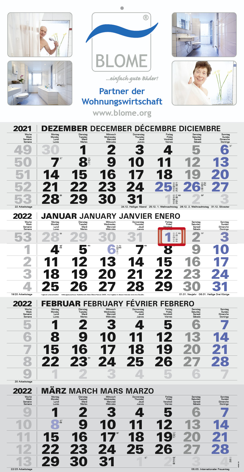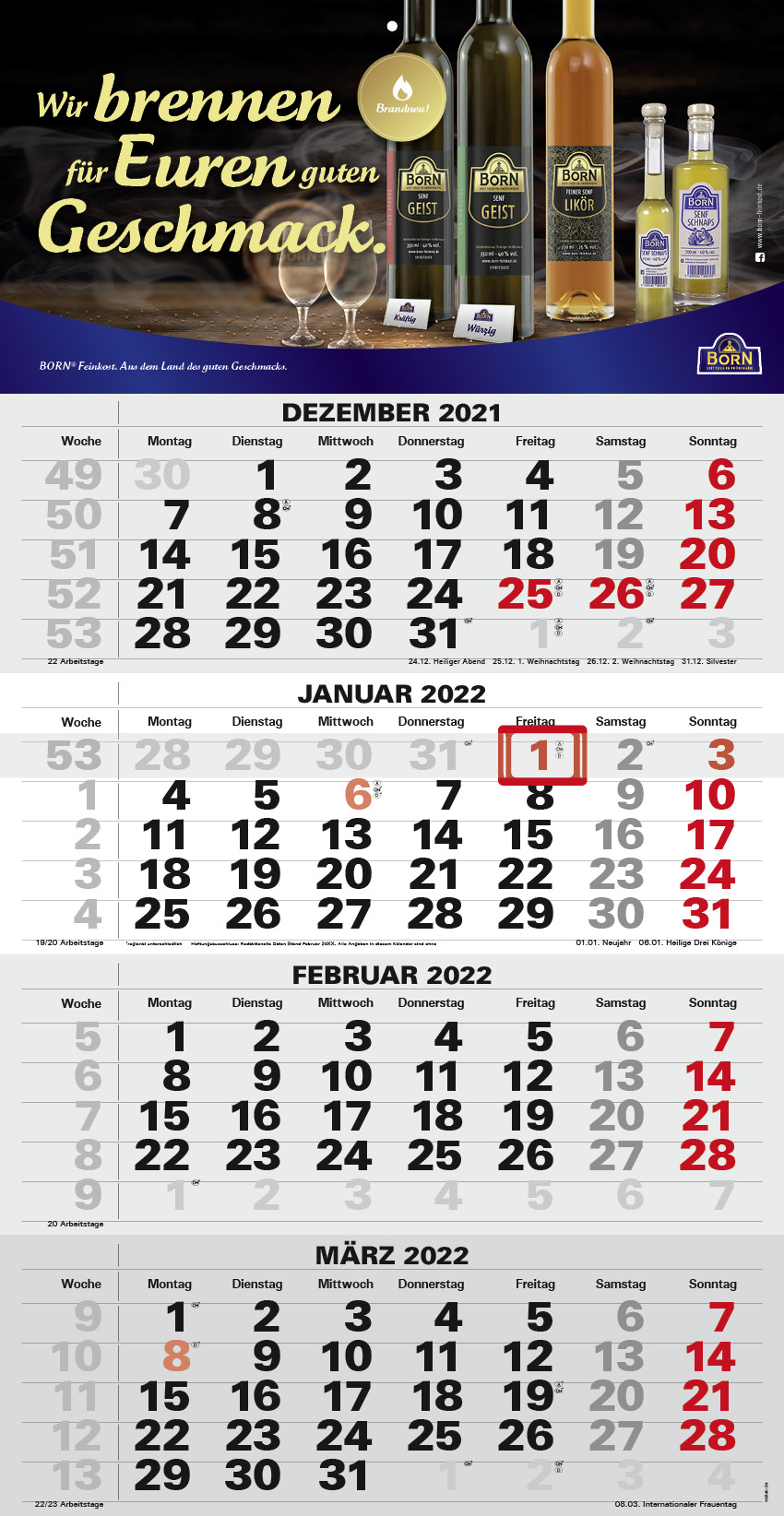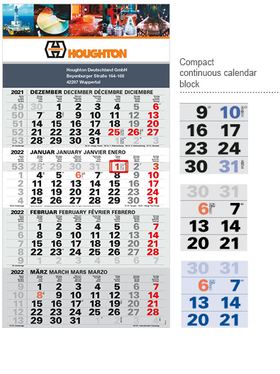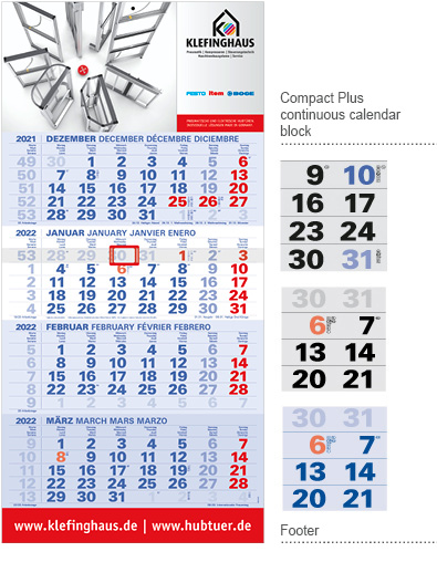 The compact calendar has a continuous calendar block to tear off. The advertising space is at the top; in the Plus version it is also at the bottom. The compact calendar is available either folded or flat. We recommend digital printing for volumes below 200.