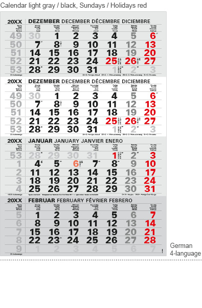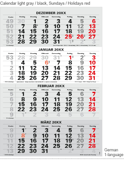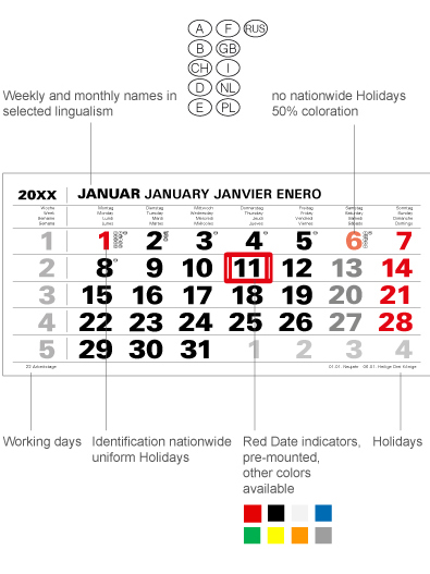 • light grey/black, Sunday and public holiday red (HKS 14)
