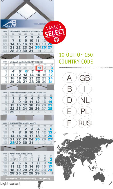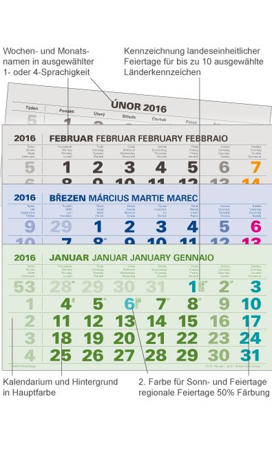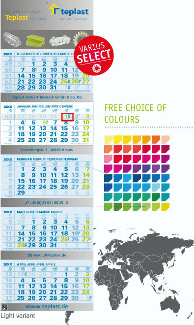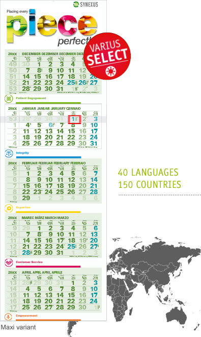 Select you yourself choose and put together the calendar from a pool of languages, countries and colours depending on your needs.