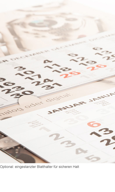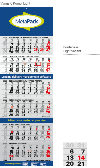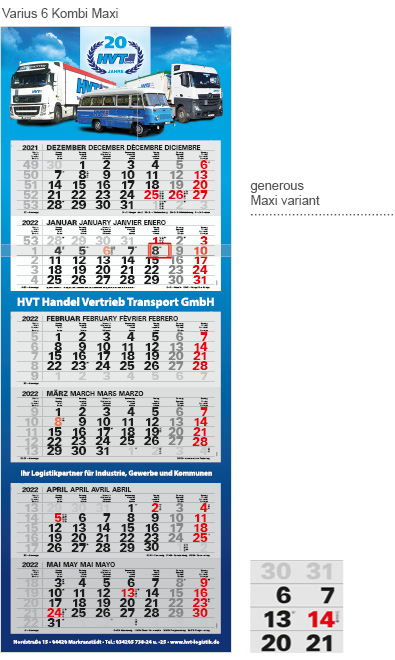 With our classics , the Varius , you have in the combo version 2 months at a block for tearing. In these 6-month variation you plan up to 4 months in advance . Between the blocks, there is additional space for advertising. Optionally, you receive Him as borderless Light or Maxi variant.