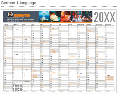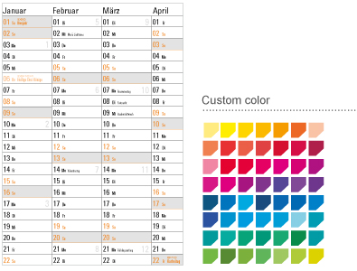 The Pin is a medium-format calendar with a traditional 12-month overview and numbering of weeks. Custom text printing is possible.
