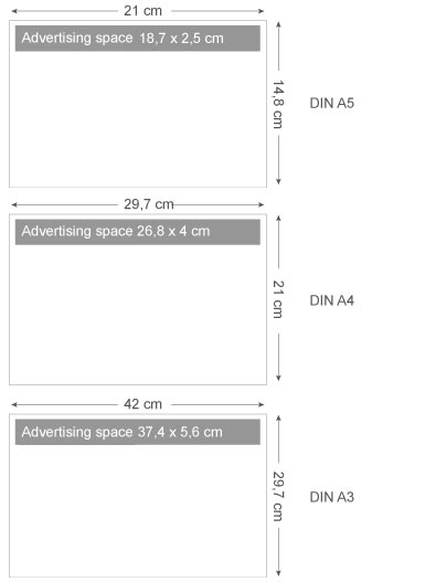 | Advertising printing | DIN A5 18,7 x 2,8 cm DIN A4 26,8 x 4 cm DIN A3 37,4 x 5,6 cm |